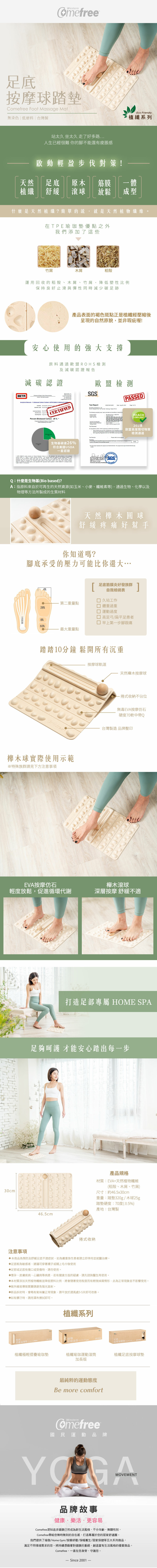 Comefree康芙麗─台灣國民運動品牌,全新推出添加可回收之植物纖維素材居家瑜珈健身系列商品,無染色,低塑料,運用回收的稻穀、木屑、竹屑,降低塑料比例,保持良好止滑與彈性同時減少碳足跡,原料通過SGS及減碳認證,保持最純粹的運動態度,使用環保又安心!啟動輕盈步伐新對策,踏踏10分鐘,鬆開所有沉重!Comefree植纖可捲式足底按摩球墊,仿鵝卵石步道設計,可隨時在家腳底按摩,不必外出跑公園原木滾球可置於軌道內,經由自身重量來回滾動,放鬆足底,可捲式收納,不占空間,最適合銀齡族、不便外出者、久站、長時間走路、體重過重的你。