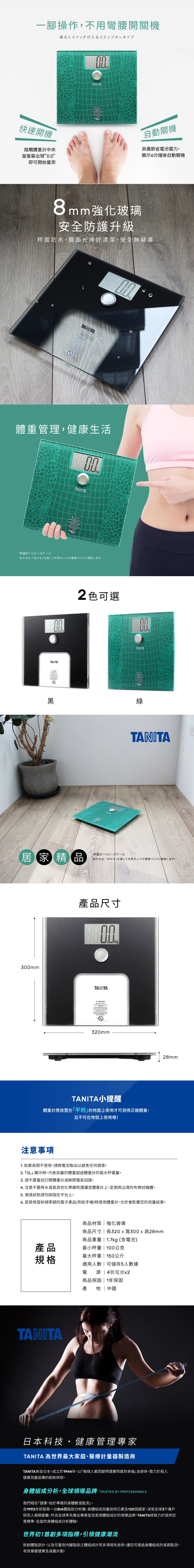 TANITA為世界最大的家庭、醫療磅秤製造商且擁有60多年生產經驗,在日本國內市場的佔有率高達七成,並高居全世界家用磅秤銷售 NO.1,其品牌知名度與商品品質皆深受消費者肯定,亦為台灣巿場中體重體脂肪管理的領導品牌。