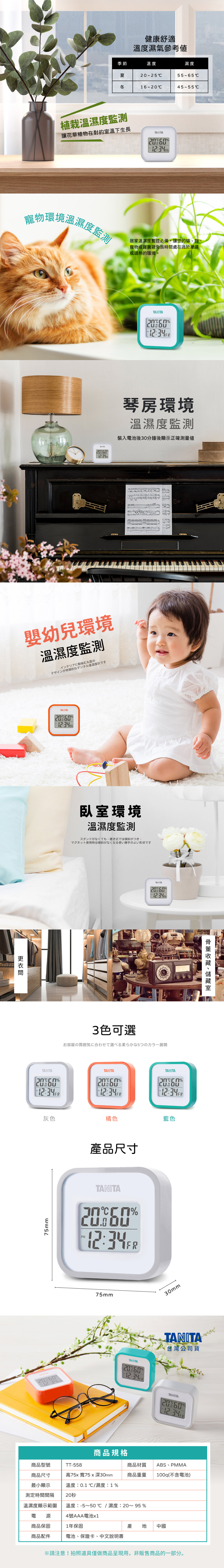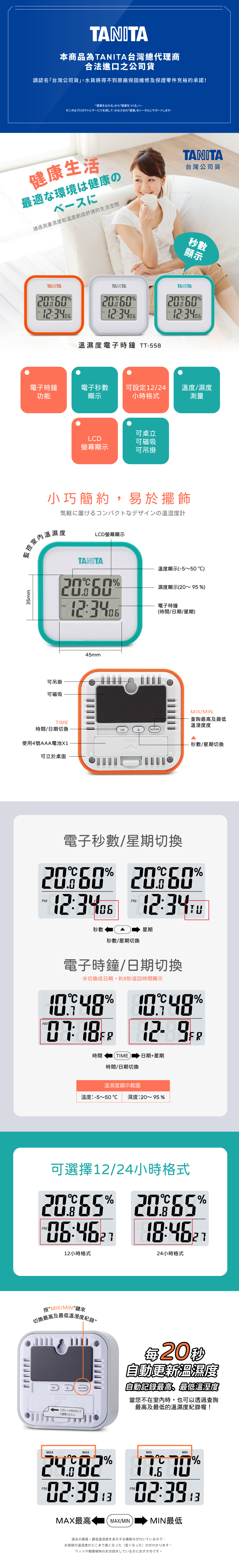 如果您想找一款有時鐘、星期及日期功能、可顯示秒數、簡約方型、可紀錄最高、最低之溫度及濕度、可磁吸、可吊掛、可立於桌面的溫濕度計,推薦您這款日本老字號大廠TANITA溫濕度電子時鐘TT-558。